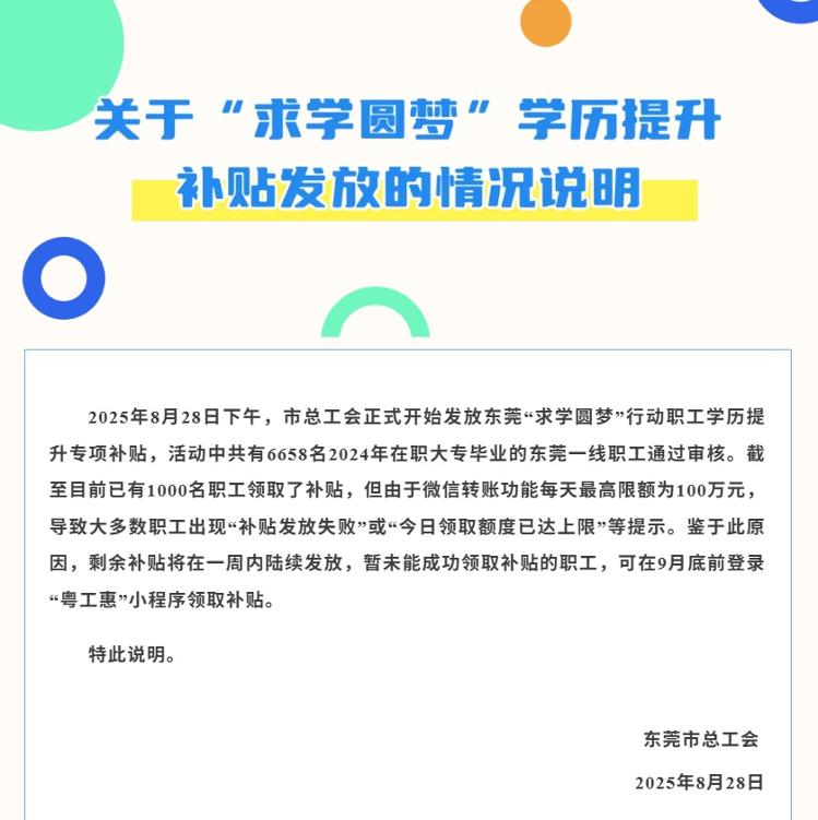 8月28日,东瓜工会联合会通过“研究和实现梦想”发布了提高学术资格的补贴的解释:2025年8月28日下午,贸易工会的市政联合会正式开始学习,梦想的梦想正式开始学习。 A total of 6,658 front-line employees in Dongguan who graduated from a college degree in 2024 passed the review. To date, 1,000 employees have received subsidies, but since the maximum sun -day -to -day limit of WeChat transfer function is 1 million yuan, most employees are motivated such as "Failed Subsidy" or "The cost of compensation has reached the upper limit now". 鉴于此原因 , 剩余补贴将在一周内陆续发放 , 暂未能成功领取补贴的职工 可在 可在 9月底前登录 "粤工惠" 小程序领取补贴。 [Pinagmulan: Dongguan Trade Union]