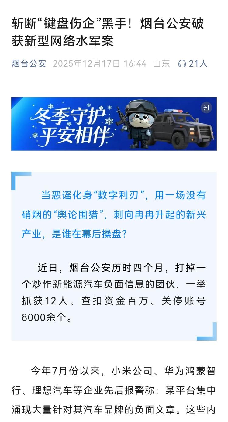 海报新闻济南记者孙杰报道。 12月17日,烟台市公安局官方微博公布了一起针对多家知名汽车企业的大规模、有组织的“网暴”犯罪案件。经过深入侦查,烟台市公安局警方成功捣毁了一个利用人工智能技术大量生产负面信息、赚取非法利润的犯罪团伙。抓获犯罪嫌疑人12名,查获涉案资金100余万元,关闭非法账户8000多个。通知指出,7月以来,多家新能源汽车企业陆续向公安机关举报称,某网络平台短时间内出现多篇针对其品牌的负面文章,且内容呈现出明显的组织性、规模化特征。这些文章并非普通消费者的真实反馈s,但有计划地通过连环炒作、歪曲解读企业公开信息进行诽谤;一些内容伪装成消费者体验、虚构用例和发布的错误信息;更有什者,通过“洗牌”、拼接、剪辑等方式,将个别问题放大、放大,制作成短视频在多个平台传播,严重损害公司品牌形象,干扰公司正常生产经营。烟台市公安局接到报案后,立即成立专案组开展调查。侦查人员对涉案平台上3000多篇负面文章进行分析发现,这些内容来自于一批注册时间短、活跃时间集中、IP地址分散的账号。他们的行为模式非常一致,背后有着明显的工业化运作痕迹。进一步调查后经侦查,犯罪团伙利用技术工具实时捕捉“小米”、“华为”、“理想”等品牌关键词,利用人工智能文本生成技术,大量制作内容雷同、质量低劣的所谓“评测”、“爆料”、“体验”文章。这些内容并非基于真实经验或客观数据,而是为了吸引点击、赚取流量而编造的。团伙成员分工明确,形成了从素材采集、AI开发、账号发布到流量变现的完整黑色产业链。为彻底摧毁该团伙,专案组以涉案虚假账号为突破口,对8万余条网上各类信息进行深入分析,核实资金流向10万余条,逐步明确了该团伙的组织架构、人员分工以及整个犯罪过程。基于证据确凿,警方近日在烟台、聊城同步开展收网行动,一次性抓获犯罪嫌疑人12名。查获涉案电子设备、银行卡等犯罪工具,冻结违法所得100万元以上,关闭用于诈骗的网络账户8000多个,实现了对新型“网暴”犯罪团伙的全链条、锐利打击。据了解,该团伙成员大多是年轻人,拥有一定的网络技术和操作经验,但他们利用自己的才能赚取非法利润,最终转向犯罪。目前,案件正在进一步审理中。 上一篇:闪电评论丨四维融合,山东文旅“融合”成新天 下一篇:没有了